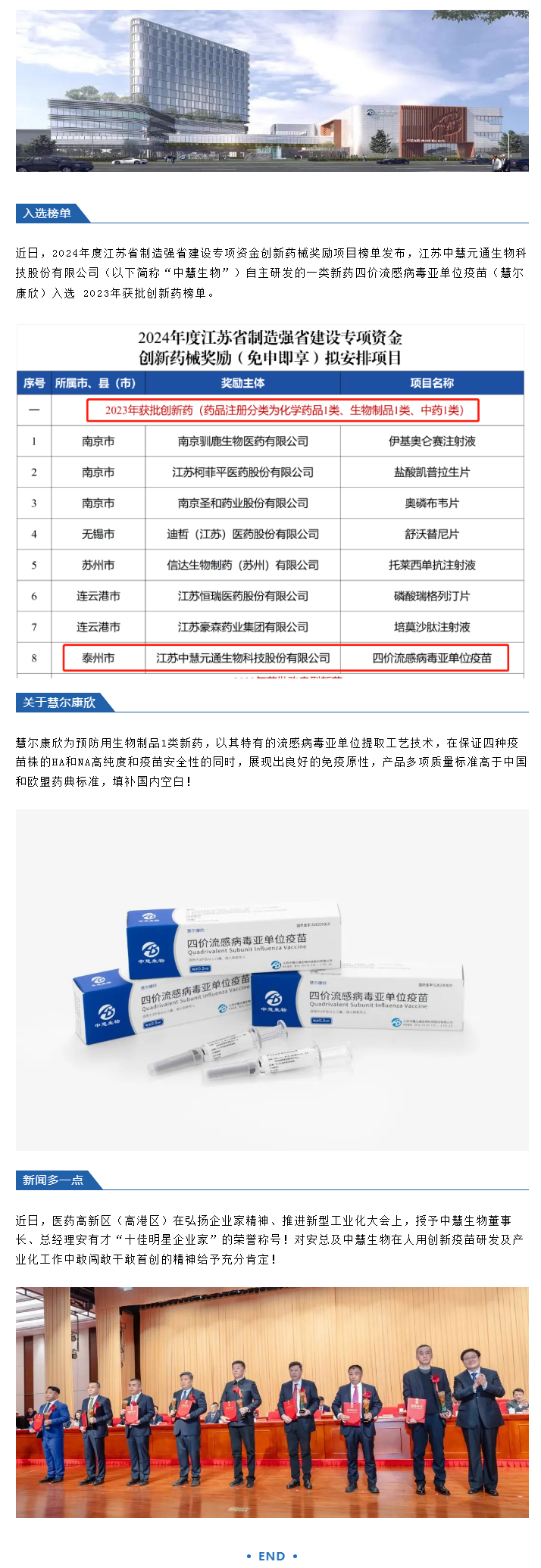 【概要描述】近日,2024年度江蘇省制造強(qiáng)省建設(shè)專項(xiàng)資金創(chuàng)新藥械獎(jiǎng)勵(lì)項(xiàng)目榜單發(fā)布,江蘇中慧元通生物科技股份有限公司(以下簡(jiǎn)稱“中慧生物”)自主研發(fā)的一類新藥四價(jià)流感病毒亞單位疫苗(慧爾康欣)入選 2023年獲批創(chuàng)新藥榜單。