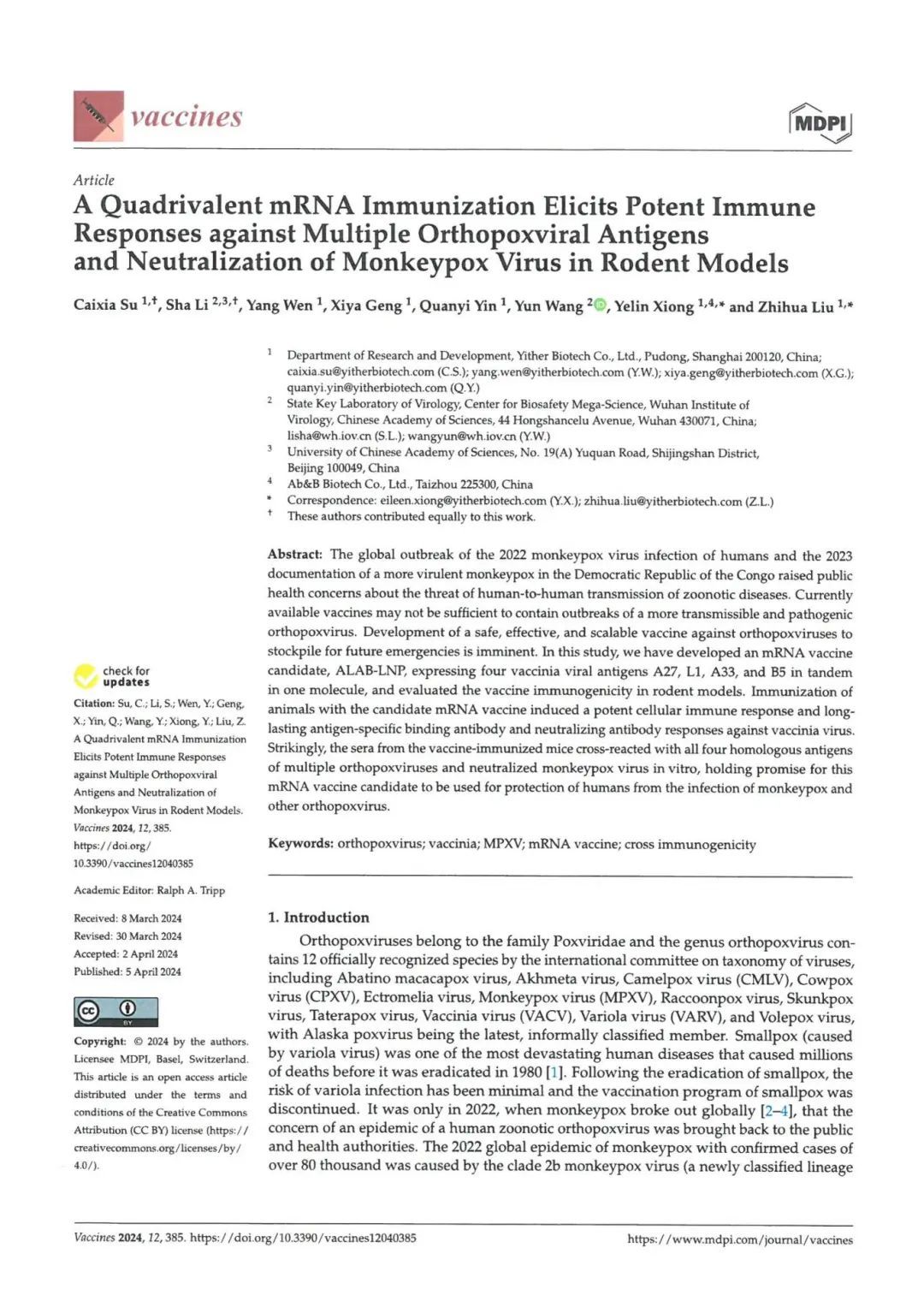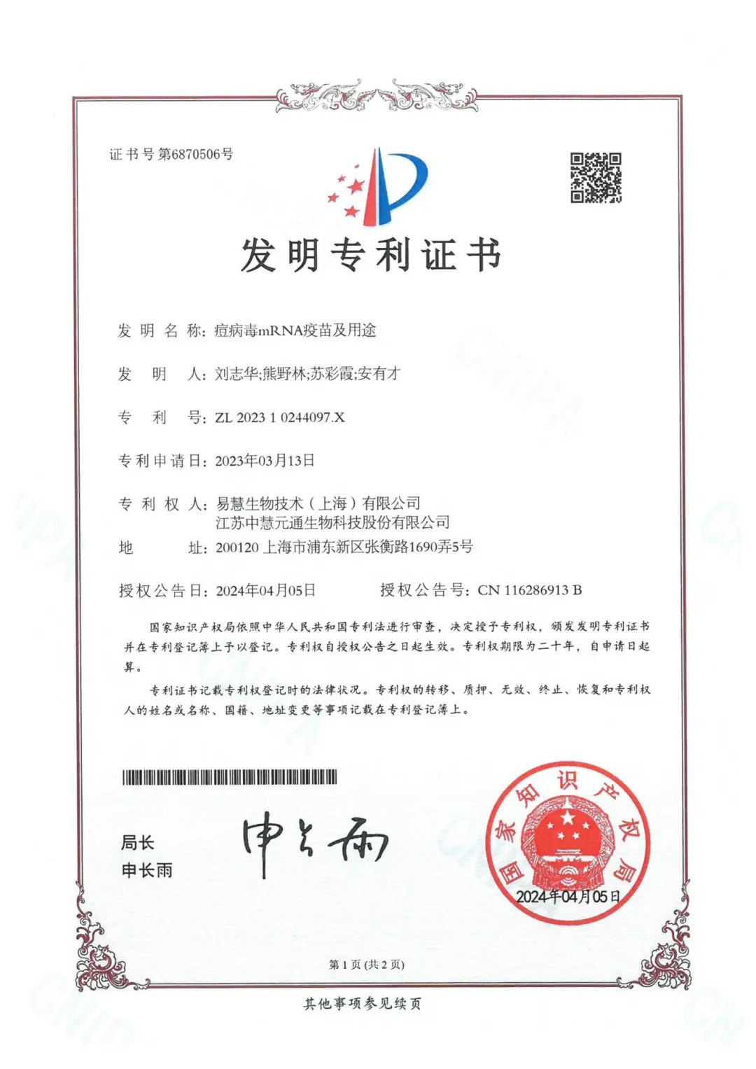 2024年4月5日,該研究成果經(jīng)國際同行專家審查評議后以“A Quadrivalent mRNA Immunization Elicits Potent Immune Responses against Multiple Orthopoxviral Antigens and Neutralization of Monkeypox Virus in Rodent Models”為題正式發(fā)表于疫苗學國際期刊《vaccines》雜志;此外,中慧生物與易慧生物聯(lián)合申請的一項名稱為“痘病毒mRNA疫苗及用途”的發(fā)明專利于2024年4月5日獲得中國國家知識產(chǎn)權(quán)局授權(quán)公告。